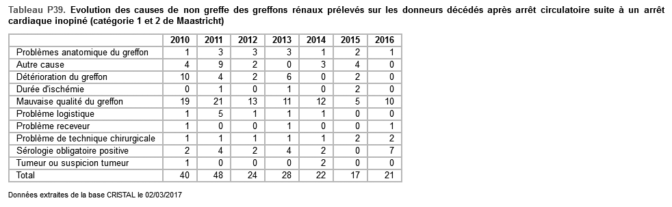 Tableau P39. Evolution des causes de non greffe des greffons rénaux prélevés sur les donneurs décédés après arrêt circulatoire suite à un arrêt cardiaque inopiné (catégorie 1 et 2 de Maastricht)