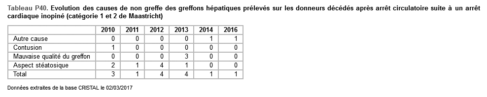 Tableau P40. Evolution des causes de non greffe des greffons hépatiques prélevés sur les donneurs décédés après arrêt circulatoire suite à un arrêt cardiaque inopiné (catégorie 1 et 2 de Maastricht)