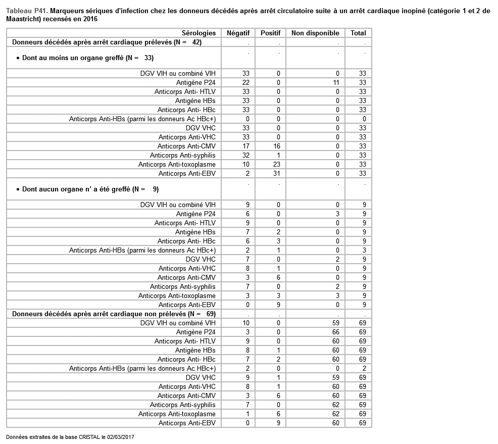 Tableau P41. Marqueurs sériques d'infection chez les donneurs décédés après arrêt circulatoire suite à un arrêt cardiaque inopiné (catégorie 1 et 2 de Maastricht) recensés en 2016