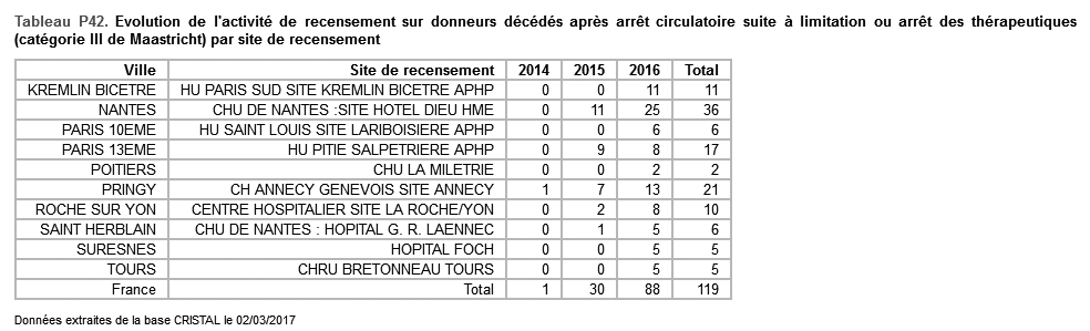 Tableau P42. Evolution de l'activité de recensement sur donneurs décédés après arrêt circulatoire suite à limitation ou arrêt des thérapeutiques (catégorie III de Maastricht) par site de recensement