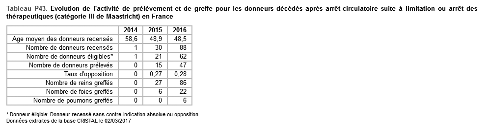 Tableau P43. Evolution de l'activité de prélèvement et de greffe pour les donneurs décédés après arrêt circulatoire suite à limitation ou arrêt des thérapeutiques (catégorie III de Maastricht) en France