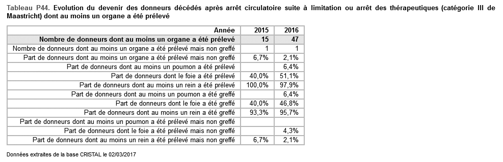 Tableau P44. Evolution du devenir des donneurs décédés après arrêt circulatoire suite à limitation ou arrêt des thérapeutiques (catégorie III de Maastricht) dont au moins un organe a été prélevé