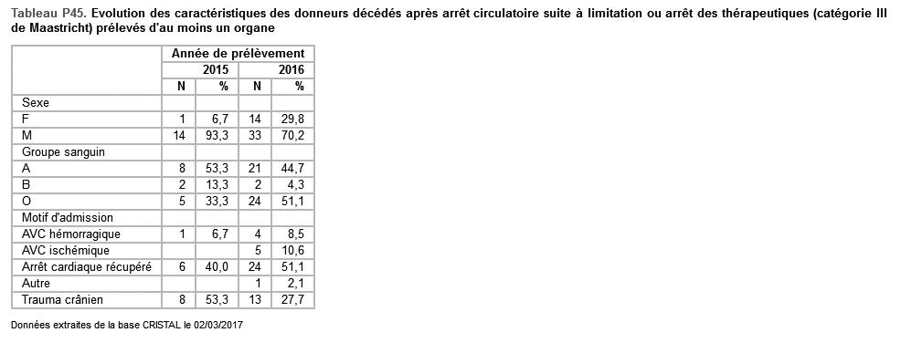 Tableau P45. Evolution des caractéristiques des donneurs décédés après arrêt circulatoire suite à limitation ou arrêt des thérapeutiques (catégorie III de Maastricht) prélevés d'au moins un organe