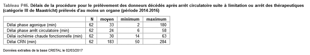 Tableau P46. Délais de la procédure pour le prélèvement des donneurs décédés après arrêt circulatoire suite à limitation ou arrêt des thérapeutiques (catégorie III de Maastricht) prélevés d'au moins un organe (période 2014-2016)