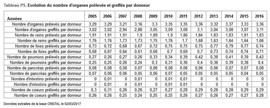 Tableau P5. Evolution du nombre d'organes prélevés et greffés par donneur
