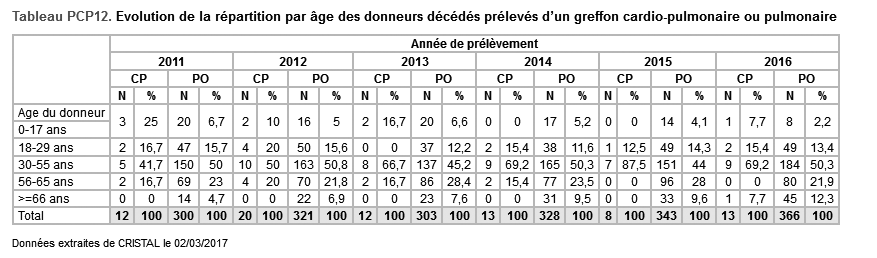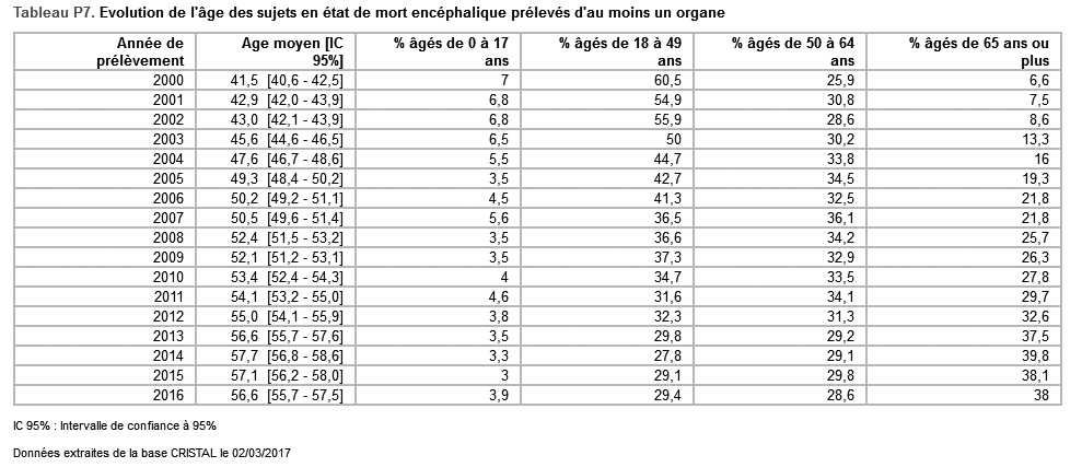 Tableau P7. Evolution de l'âge des sujets en état de mort encéphalique prélevés d'au moins un organe