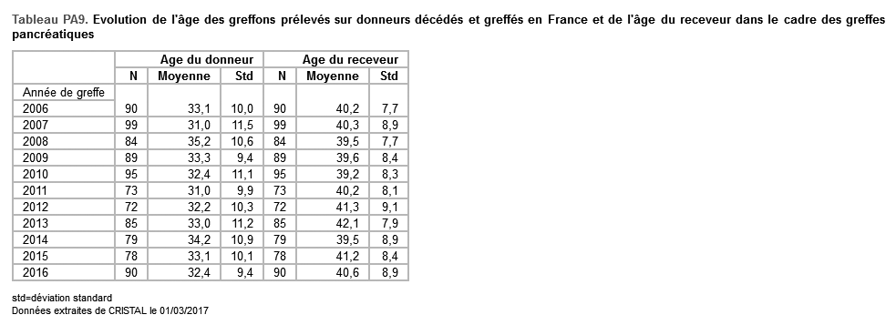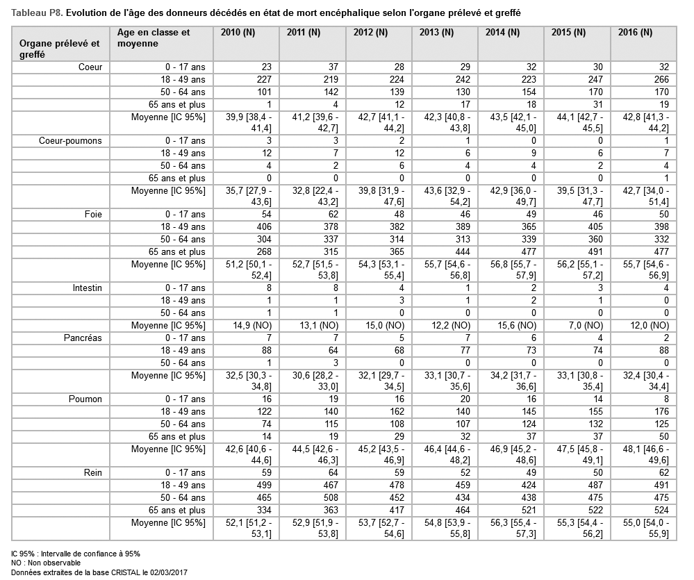 Tableau P8. Evolution de l'âge des donneurs décédés en état de mort encéphalique selon l'organe prélevé et greffé