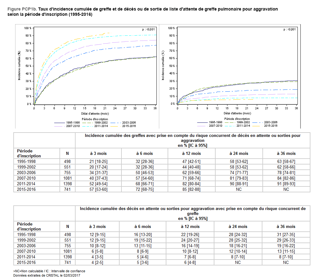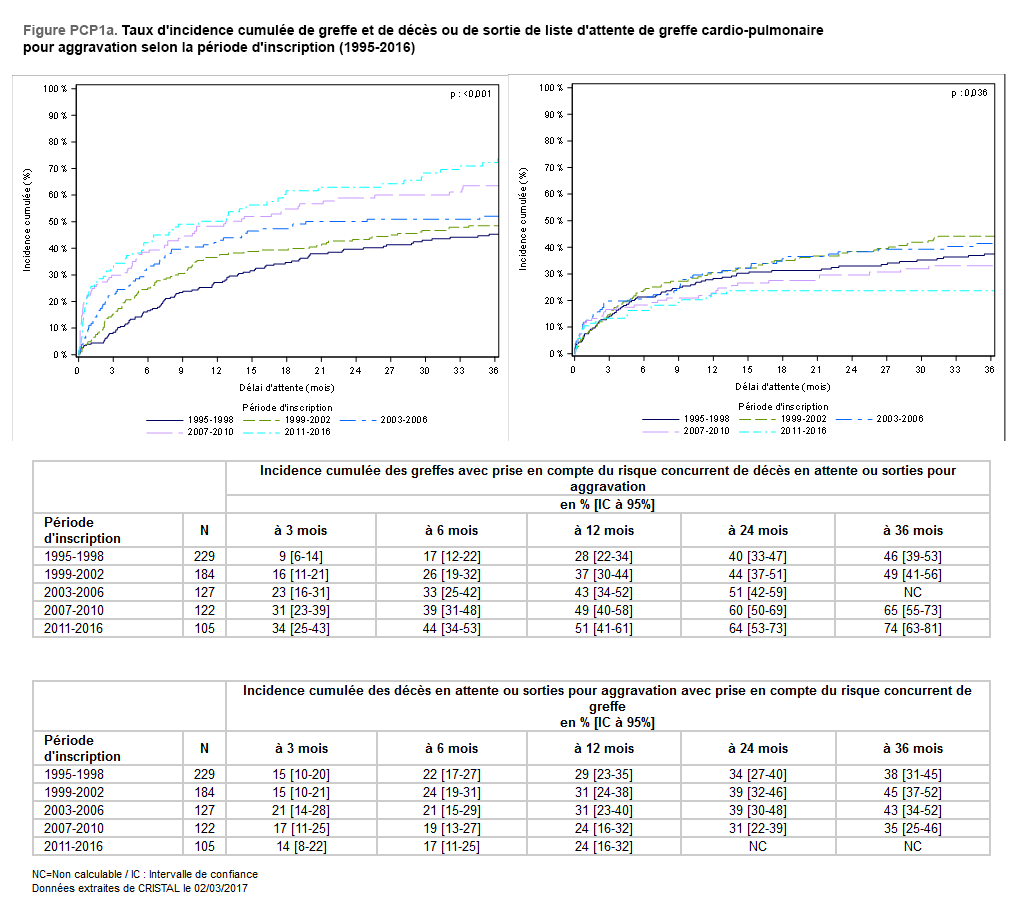 Figure C1. Taux d'incidence cumulée de greffe et de décès ou de sortie de liste pour aggravation des nouveaux inscrits en liste d’attente de greffe cardiaque selon la période d'inscription (1995-2016)
