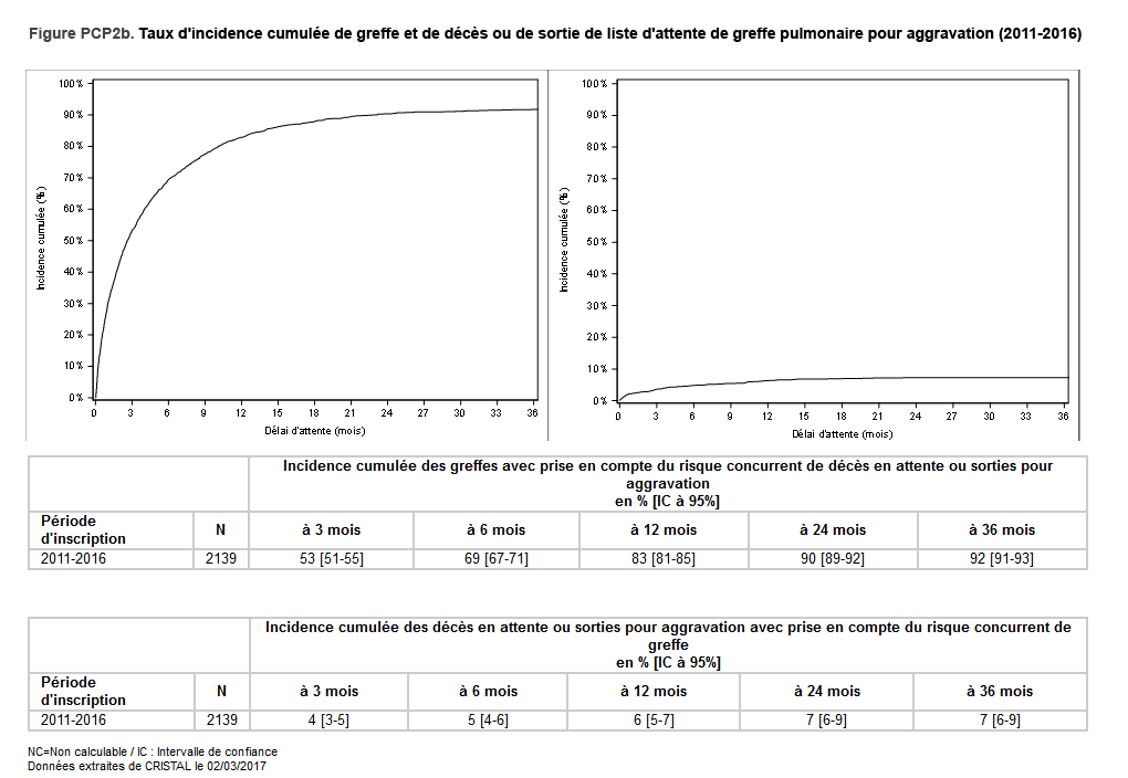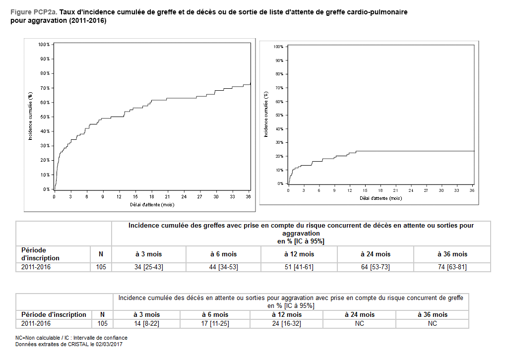 Figure C2. Taux d'incidence cumulée de greffe et de décès ou sortie de liste pour aggravation des nouveaux inscrits en liste d’attente de greffe cardiaque (2011-2016)