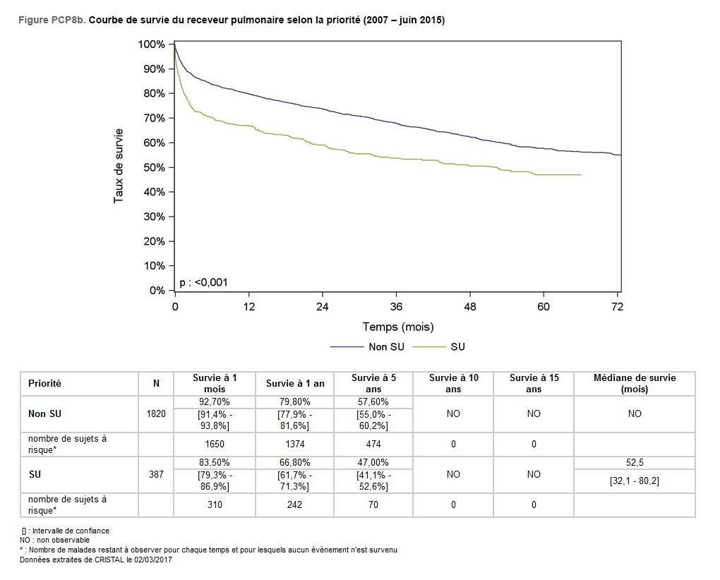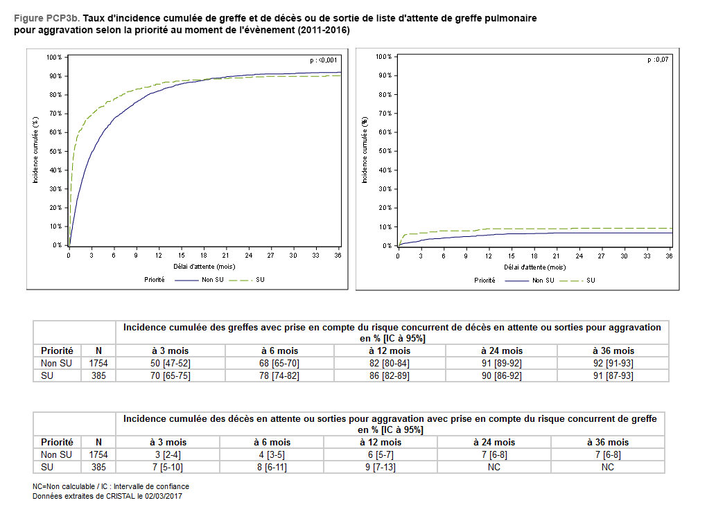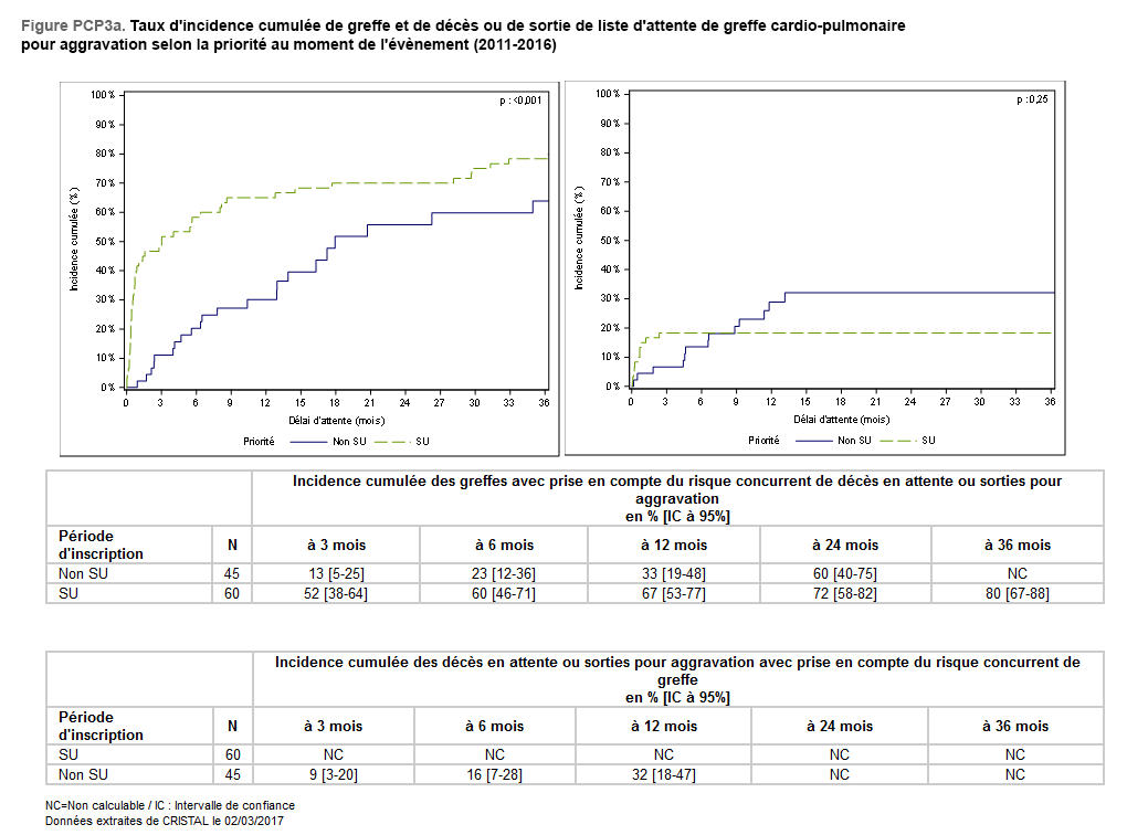 Figure C3. Taux d'incidence cumulée de greffe et de décès ou sortie de liste pour aggravation des nouveaux inscrits en liste d’attente de greffe cardiaque selon la dernière priorité (2011-2016)
