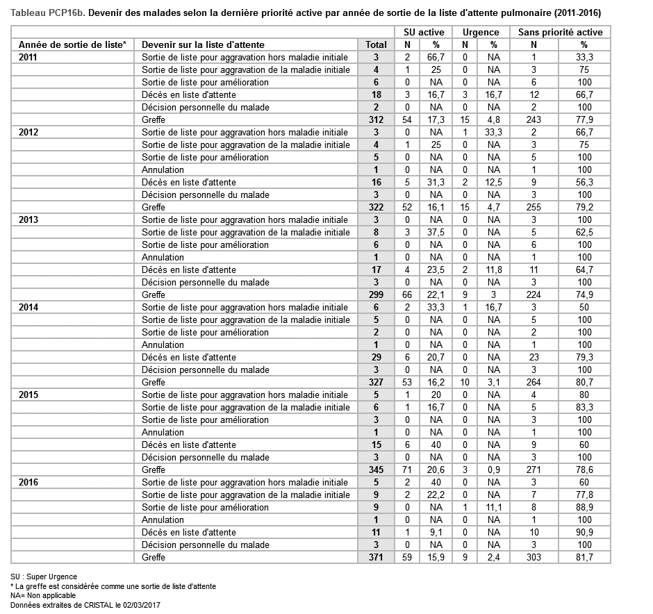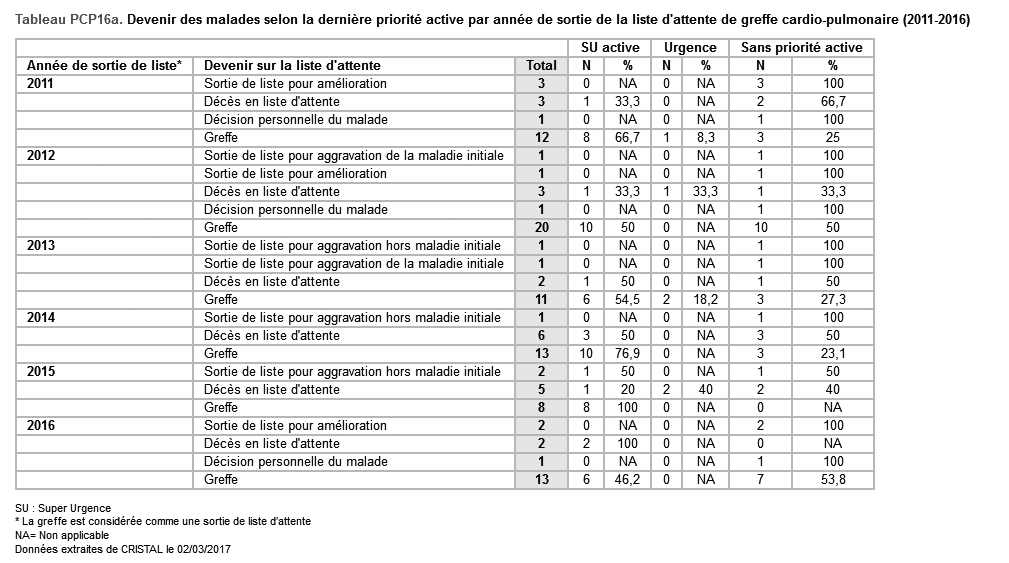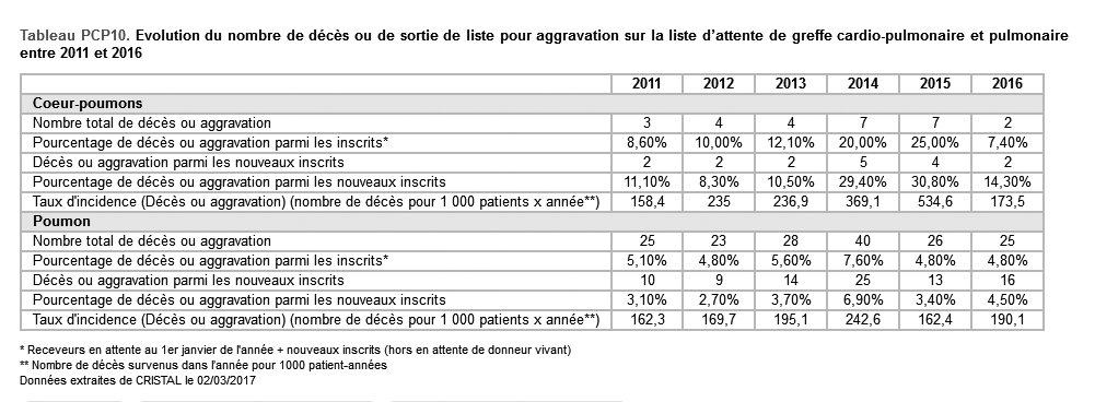 Tableau C10. Evolution du nombre de décès ou sorties de liste pour aggravation de l'état médical sur la liste d’attente entre 2011 et 2016 chez les malades en attente d’une greffe cardiaque