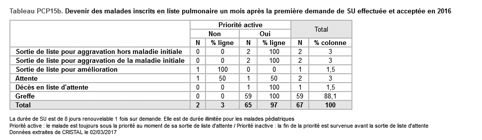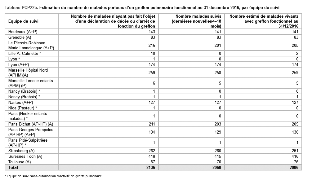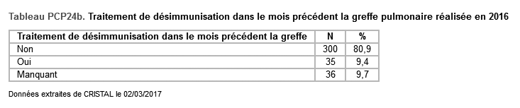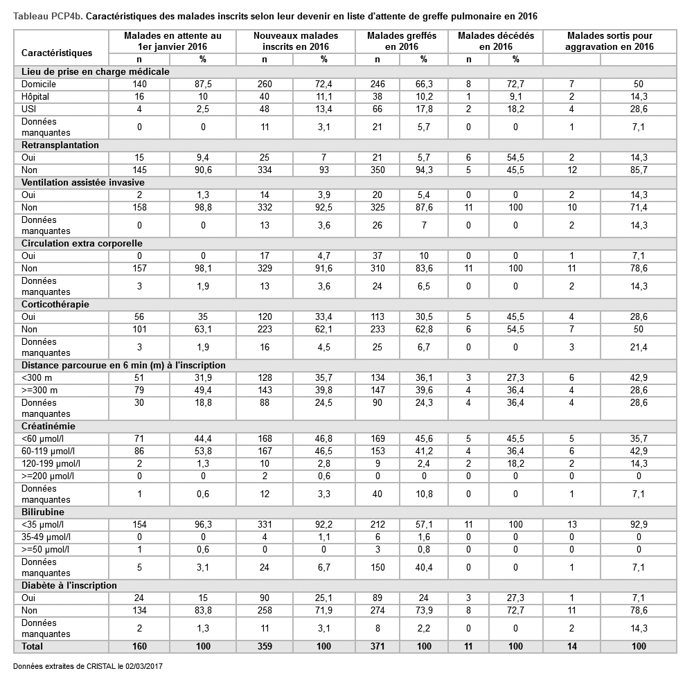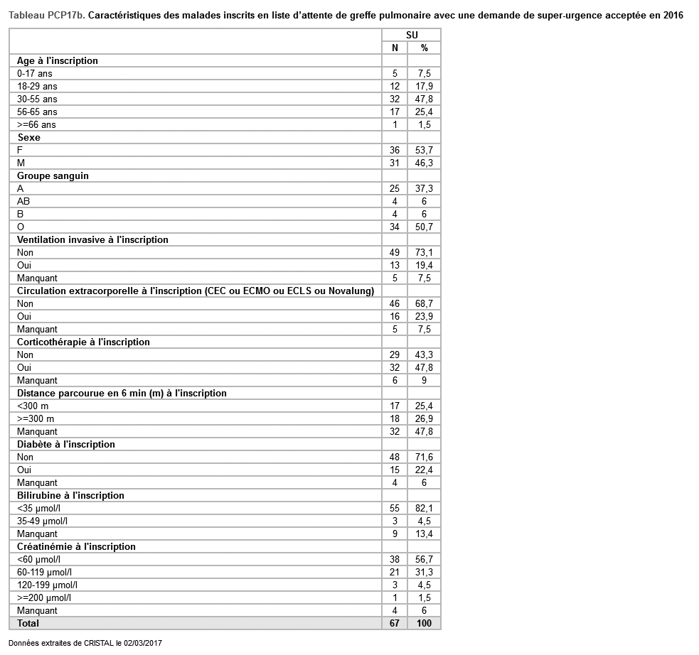 Tableau G16. Poumon - Pourcentage de données manquantes du bilan médical à l’inscription pour les malades inscrits en 2016 et du bilan médical à la greffe pour les malades greffés en 2016
