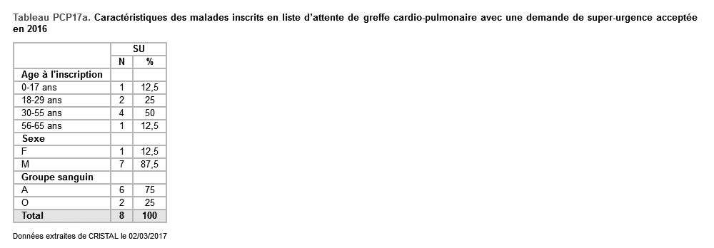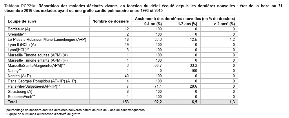 Tableau G13. Cœur-Poumons - Pourcentage de données manquantes du bilan médical à l’inscription pour les malades inscrits en 2016 et du bilan médical à la greffe pour les malades greffés en 2016