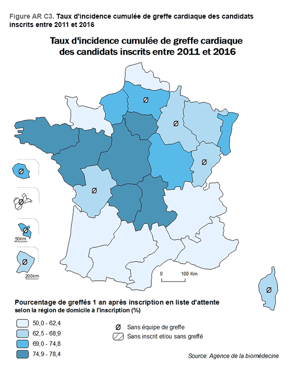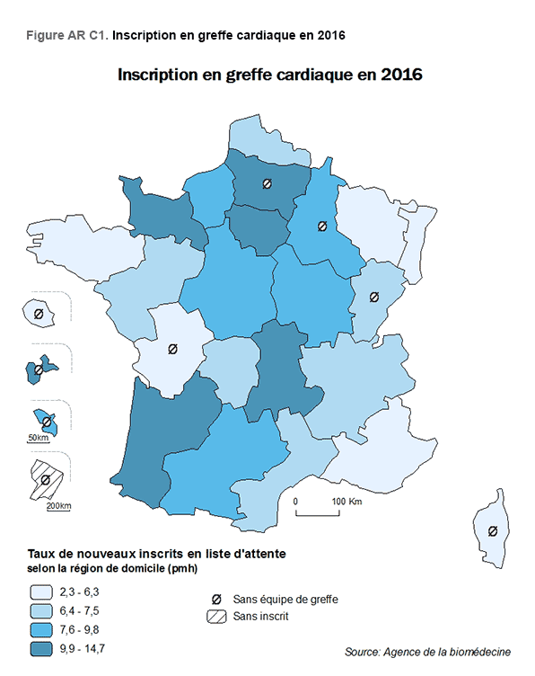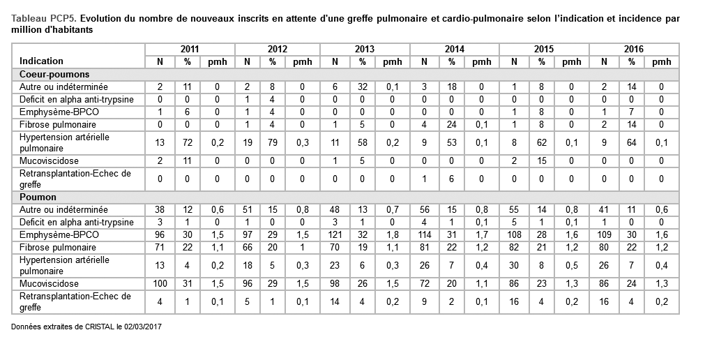 Tableau C5. Evolution du nombre de nouveaux inscrits en attente d'une greffe cardiaque selon l’indication et incidence par million d'habitants