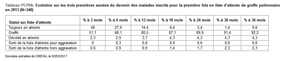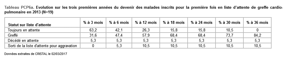 Tableau C6. Evolution sur les trois premières années du devenir des malades inscrits pour la première fois en liste d’attente cardiaque en 2013 (N=538)