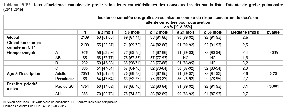 Tableau C7. Taux d'incidence cumulée de greffe des nouveaux inscrits sur liste d’attente cardiaque selon leurs caractéristiques (2011-2016)