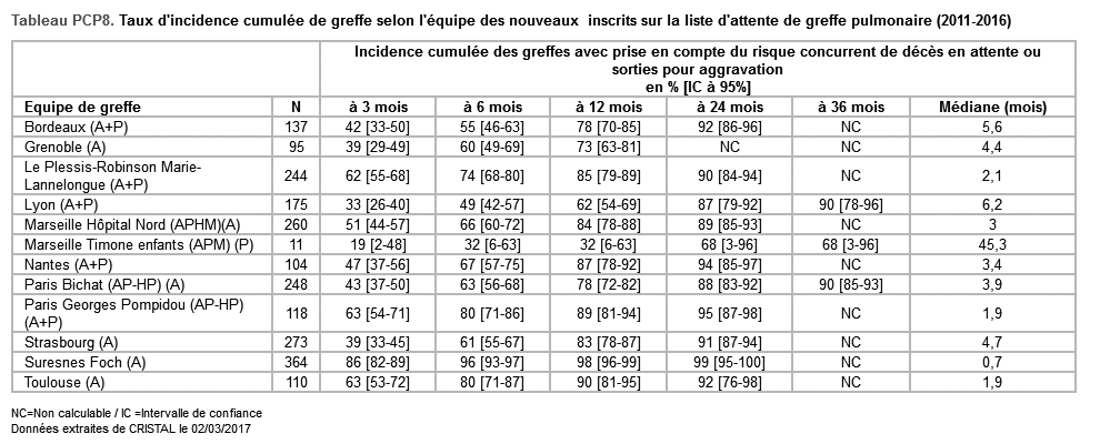 Tableau C8. Taux d'incidence cumulée de greffe des nouveaux inscrits sur liste d’attente cardiaque selon l'équipe de greffe (2011-2016)