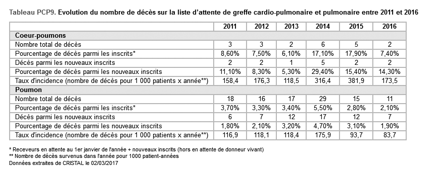 Tableau C9. Evolution du nombre de décès sur la liste d’attente entre 2011 et 2016 chez les malades en attente d’une greffe cardiaque