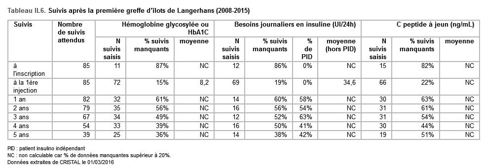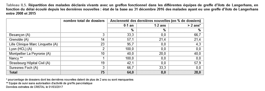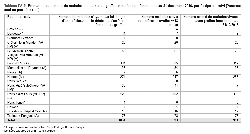 Tableau G15. Pancréas - Pourcentage de données manquantes du bilan médical à l’inscription pour les malades inscrits en 2016 et du bilan médical à la greffe pour les malades greffés en 2016