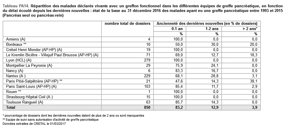 Tableau G14. Foie - Pourcentage de données manquantes du bilan médical à l’inscription pour les malades inscrits en 2016 et du bilan médical à la greffe pour les malades greffés en 2016