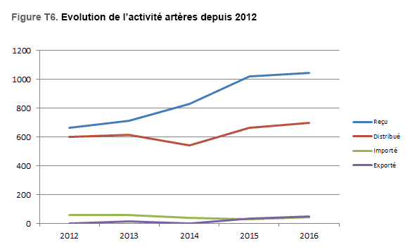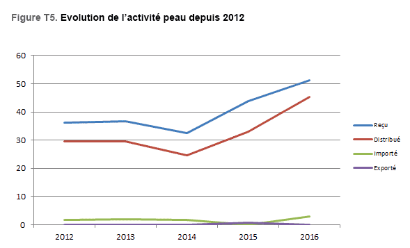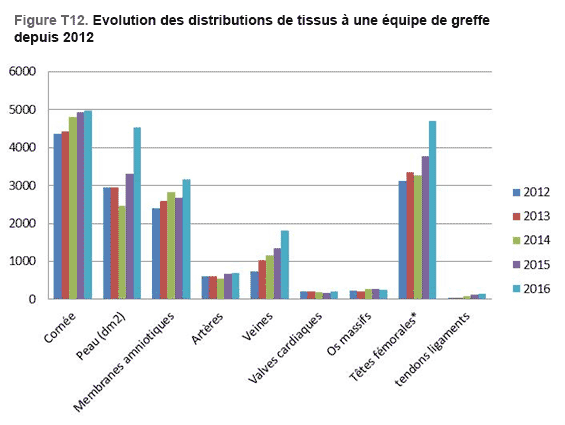Figure T12. Evolution des distributions de tissus à une équipe de greffe depuis 2012 (issue du tableau T21)