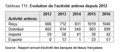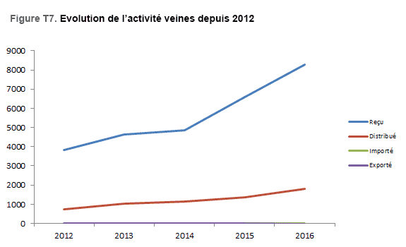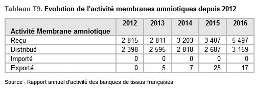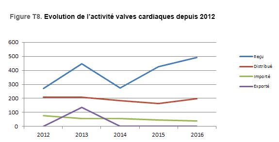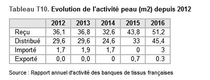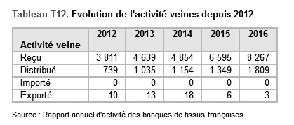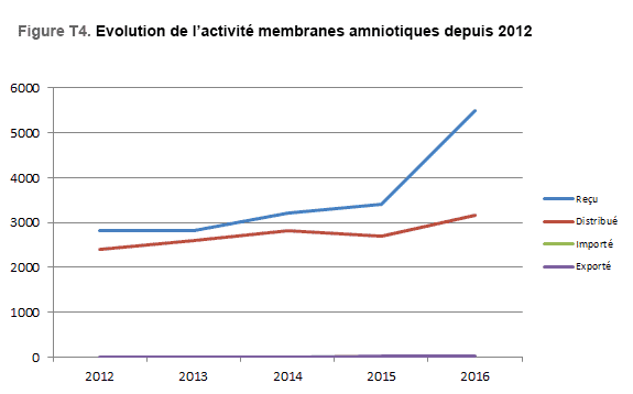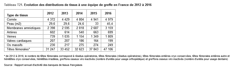 Tableau T21. Evolution des distributions de tissus à une équipe de greffe en France de 2012 à 2016