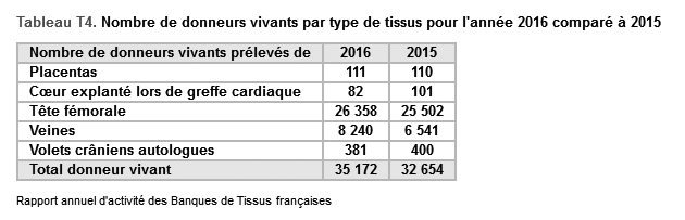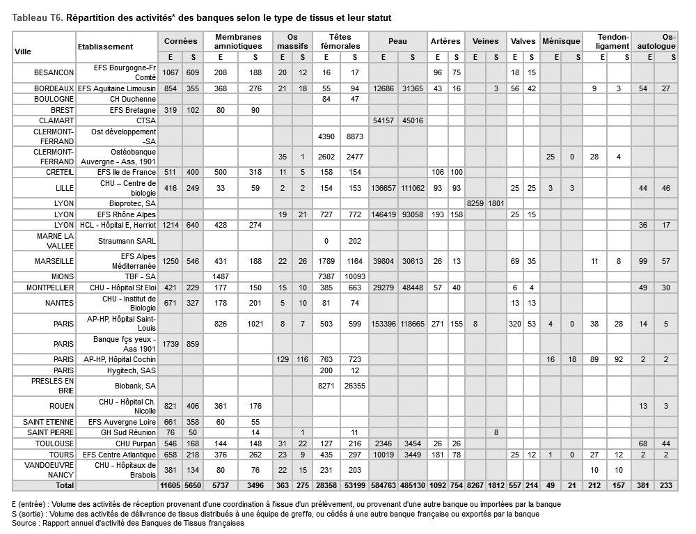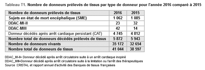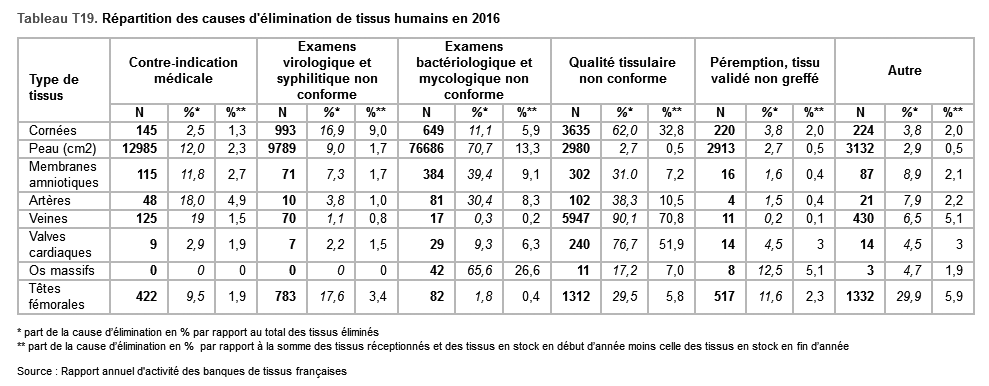 Tableau T19. Répartition des causes d'élimination de tissus humains en 2016