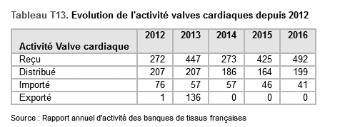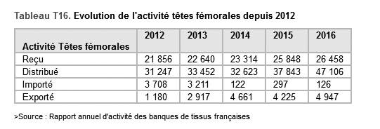 Tableau T16. Evolution de l'activité têtes fémorales depuis 2012