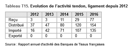 Tableau T15. Evolution de l’activité tendon, ligament depuis 2012