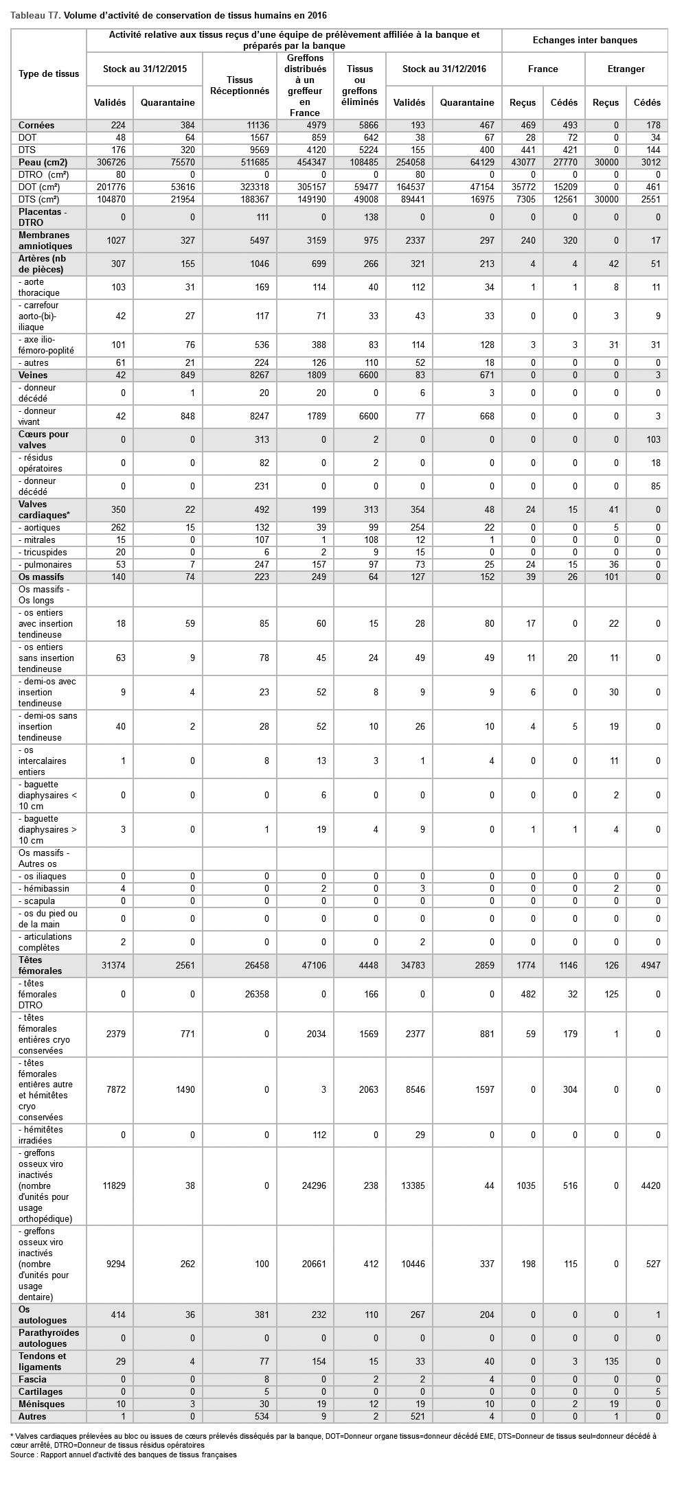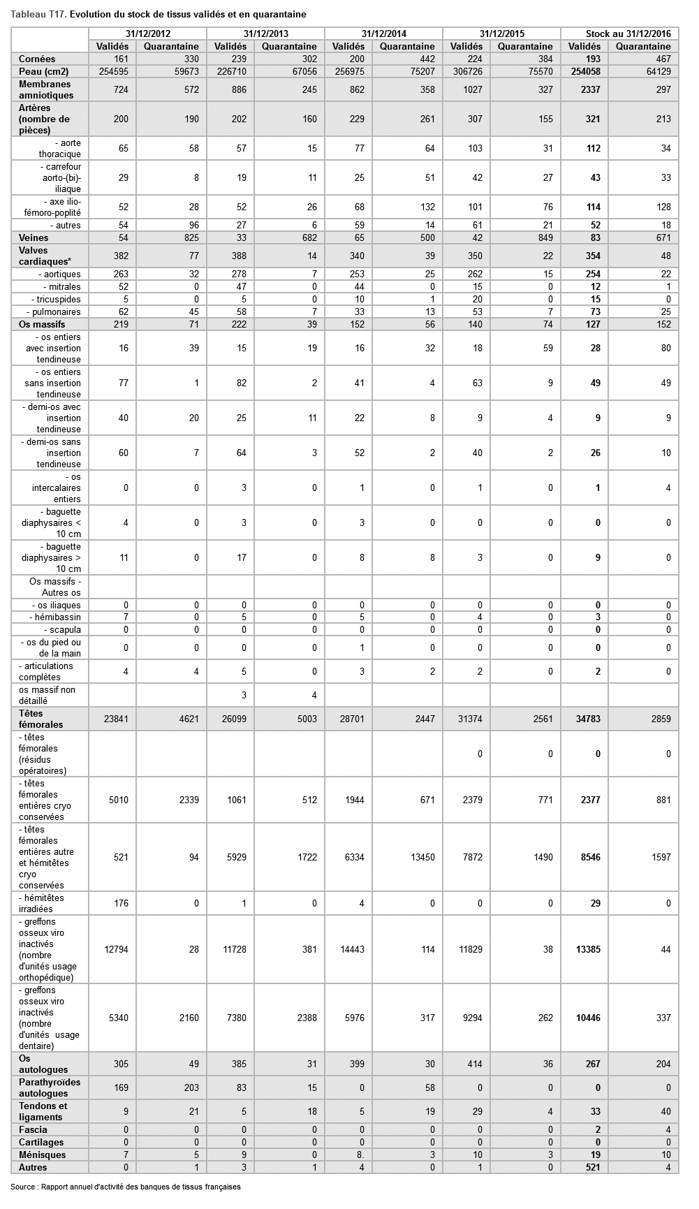 Tableau T17. Evolution du stock de tissus validés et en quarantaine