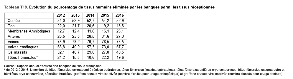Tableau T18. Evolution du pourcentage de tissus humains éliminés par les banques parmi les tissus réceptionnés