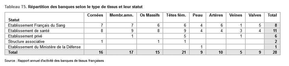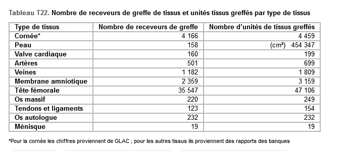 Tableau T22. Nombre de receveurs de greffe de tissus et unités tissus greffés par type de tissus