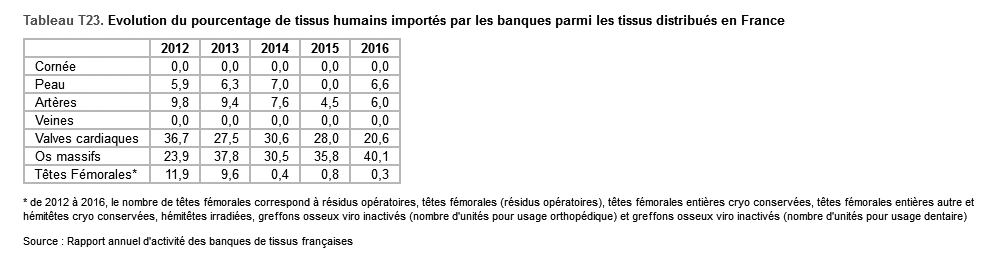 Tableau T23. Evolution du pourcentage de tissus humains importés par les banques parmi les tissus distribués en France