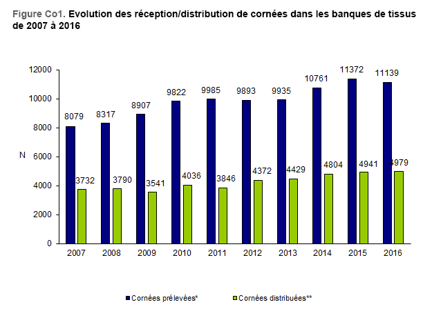 Figure Co1. Evolution des réception/distribution de cornées dans les banques de tissus de 2007 à 2016