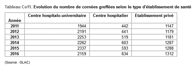 Tableau Co11. Evolution du nombre de cornées greffées selon le type d'établissement de santé