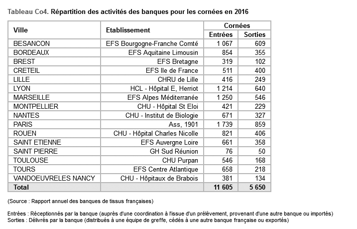 Tableau Co4. Répartition des activités des banques pour les cornées en 2016