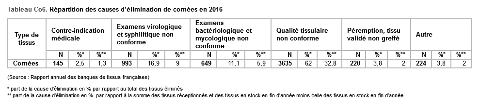 Tableau Co6. Répartition des causes d’élimination de cornées en 2016