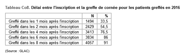 Tableau Co8. Délai entre l'inscription et la greffe de cornée pour les patients greffés en 2016