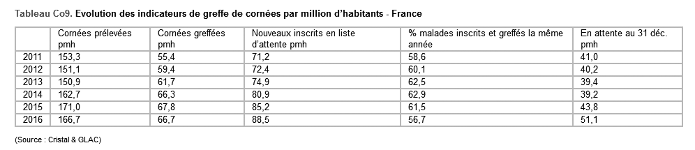 Tableau Co9. Evolution des indicateurs de greffe de cornées par million d’habitants - France