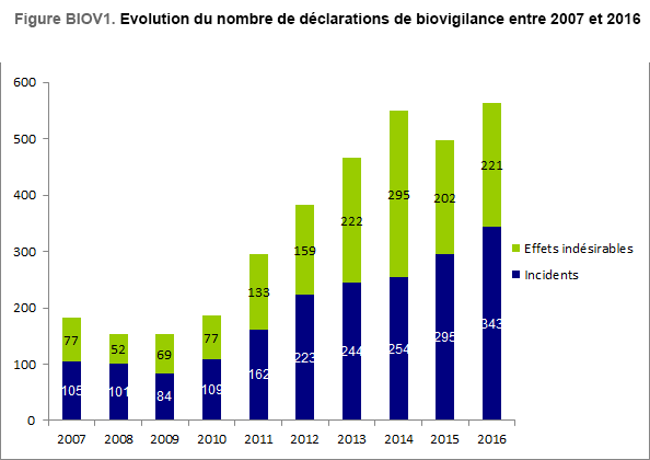 Figure BIOV1. Evolution du nombre de déclarations de biovigilance entre 2007 et 2016