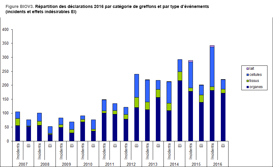 Figure BIOV3. Répartition des déclarations 2016 par catégorie de greffons et par type d’événements (incidents et effets indésirables EI)