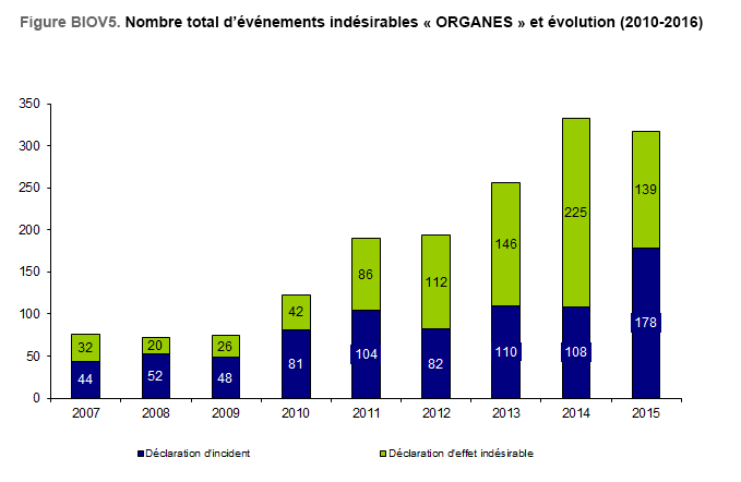 Figure BIOV5. Nombre total d’événements indésirables « ORGANES » et évolution (2010-2016)