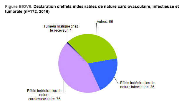 Figure BIOV6. Déclaration d’effets indésirables de nature cardiovasculaire, infectieuse et tumorale (n=172, 2016)
