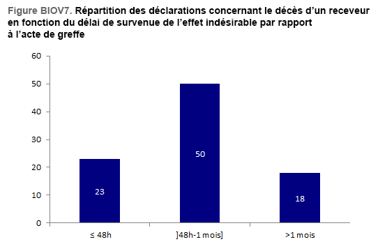 Figure BIOV7. Répartition des déclarations concernant le décès d’un receveur en fonction du délai de survenue de l’effet indésirable par rapport à l’acte de greffe