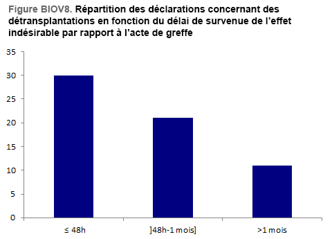 Figure BIOV8. Répartition des déclarations concernant des détransplantations en fonction du délai de survenue de l’effet indésirable par rapport à l’acte de greffe