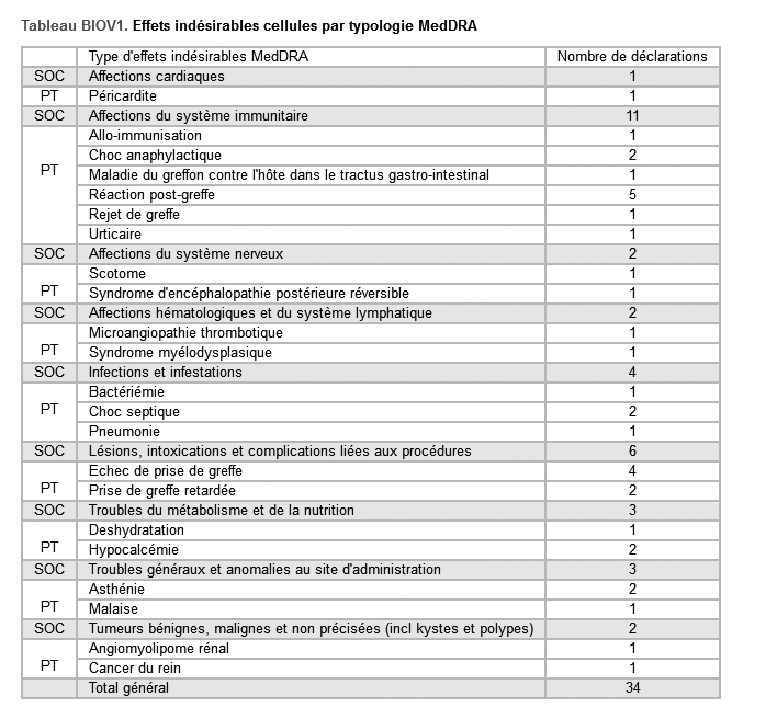 Tableau BIOV1. Effets indésirables cellules par typologie MedDRA