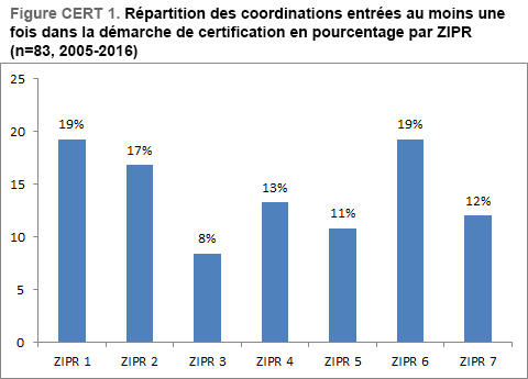 Figure CERT 1. Répartition des coordinations entrées au moins une fois dans la démarche de certification en pourcentage par ZIPR (n=83, 2005-2016)