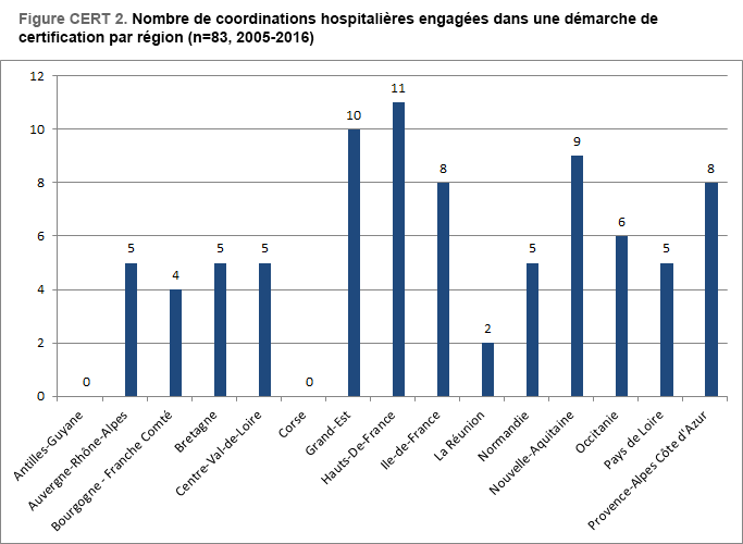 Figure CERT 2. Nombre de coordinations hospitalières engagées dans une démarche de certification par région (n=83, 2005-2016)