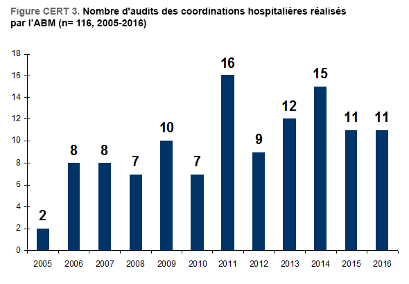 Figure CERT 3. Nombre d'audits des coordinations hospitalières réalisés par l’ABM (n= 116, 2005-2016)