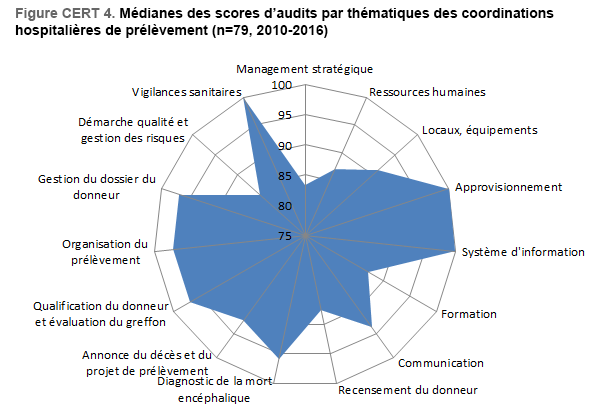 Figure CERT 4. Médianes des scores d’audits par thématiques des coordinations hospitalières de prélèvement (n=79, 2010-2016)